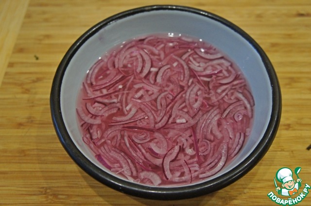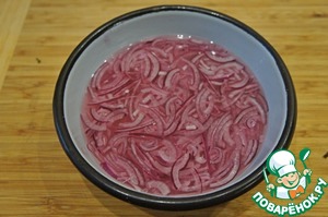 Лук очистить и нашинковать тонкими полукольцами. Замариновать воде с уксусом, солью и сахаром. Маринад должен быть кисло-сладким.