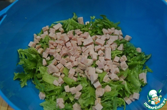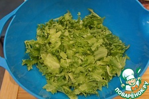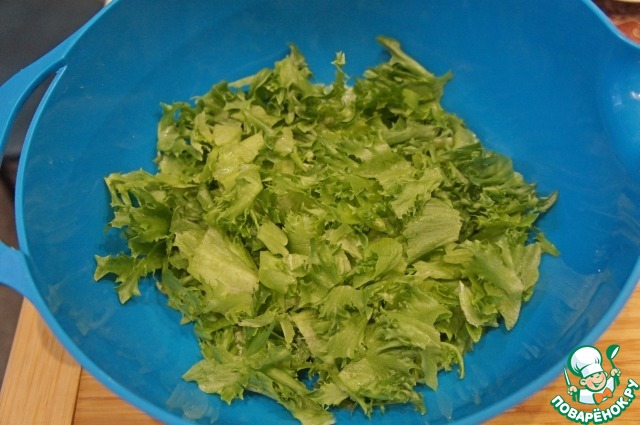 Салат (это может быть фриллис, фризе или романо) нарвать руками, выложить в глубокую миску.