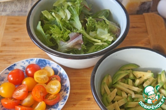 Овощи и зелень вымыть и обсушить. Помидоры разрезать пополам, у авокадо удалить косточку, извлечь мякоть и разрезать ломтиками.