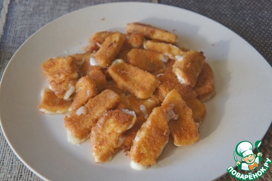 Сулугуни нарезать на кусочки. Яйцо взбить вилкой, немного посолить. Кусочки сыра обвалять в муке, обмакнуть в льезон и обвалять в панировочных сухарях.