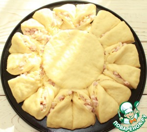 Придать руками форму лепешки, выложить в центр начинку (оставить немного для украшения).