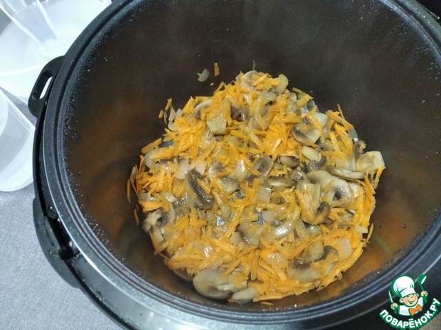 Отправляем в чашу - масло+лук+шампиньоны - Режим "Жарка" 10 минут.