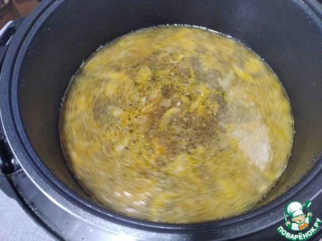 Добавляем в чашу - 1.5л воды+специи - Режим "Суп" 30 минут.