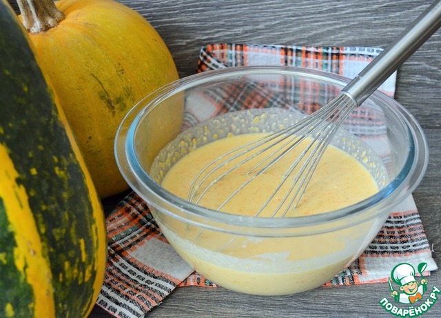 Тыкву пробить блендером ( у меня очень спелая и мягкая) или натереть на мелкой тёрке, добавить яйца, соль, сахар. Взбить венчиком.