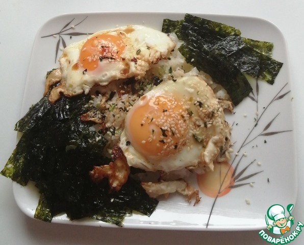 • На рис выложить яйца, сбрызнуть ещё соевым соусом и кунжутным маслом. Ещё посыпают зелёным луком, но я не особо люблю его с яичницей, да и не было его у меня. Посыпать кунжутом.