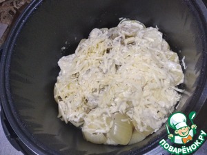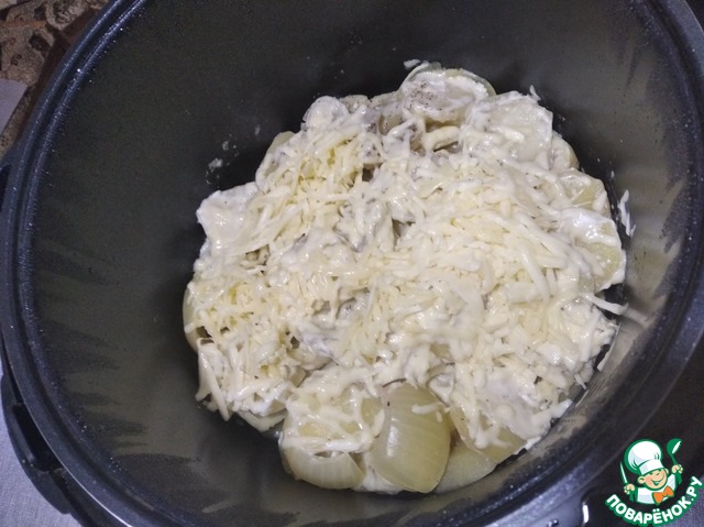 Укладываем слоями - Картофель (без майонеза), половина лука, залить воду, уложить куски хека, вторая половина лука и накрыть всё картофелем что был смешан с майонезом - Режим "Тушение" 60 минут.