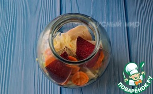 Зучик чеснока на 5-6 частей. Все уложить слоями, добавить лаврушку и перец горошком.