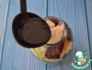 Маринад: в кипящую воду всыпать соль и сахар, перемещать до растворения, влить уксус и растительное масло, дать закипеть и залить овощи