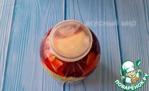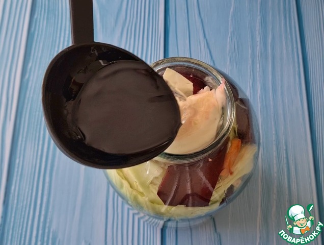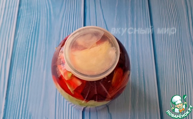 Накрыть резиновой крышкой и оставить на сутки при комнатной температуре. Капуста промаринуется через сутки.