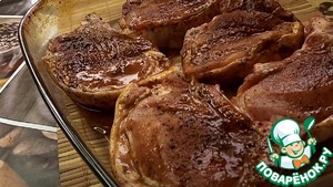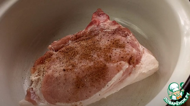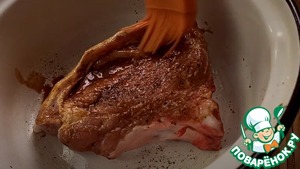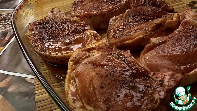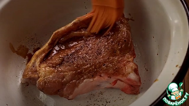 Каждый кусочек свиной корейки смазываем маринадом, который сделали ранее. Оставляем на минут 30,