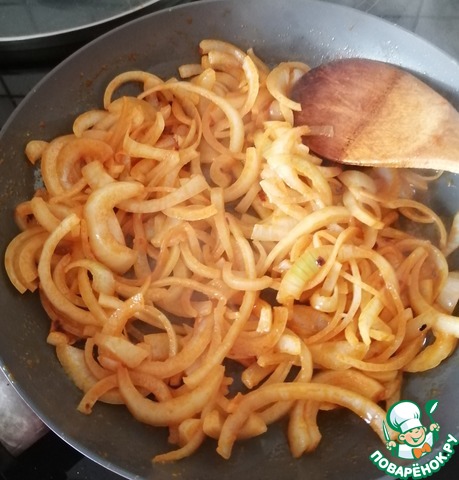Растопить сливочное масло, добавить красный острый перец и сладкую паприку по вкусу. Кто не любит острое, то можно добавить больше паприки. Добавляем лук, немного присаливаеми и пассеруем до мягкости. В конце добавляется чеснок. -