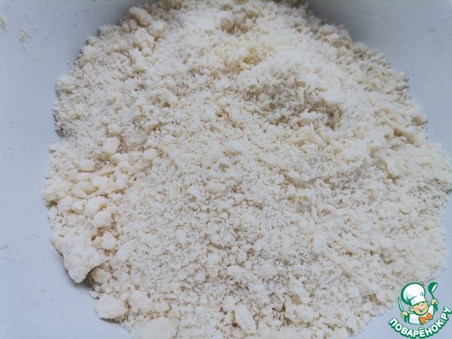 Муку смешать со сливочным маслом и сахаром. Руками или при помощи блендера растереть в крошку.