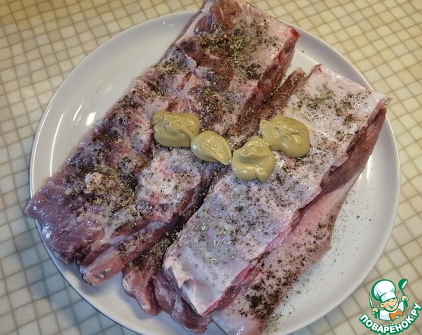 Свиные рёбрышки посыпать орегано, солью и перцем по вкусу, добавить горчицы. Всё втереть в рёбрышки с обеих сторон и оставить на 20 минут.