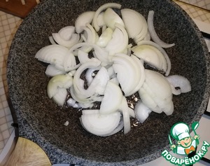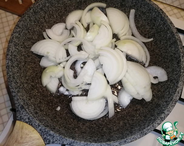 За это время лук нарезать полукольцами. В разогретую сковороду налить растительное масло и высыпать лук. Жарить 5 минут изредка помешивая.