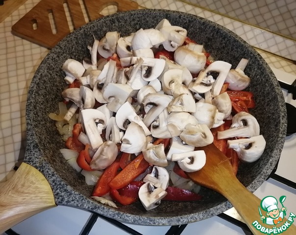 Чистим шампиньоны, нарезаем четвертинками и добавляем в сковороду к остальным ингредиентам. Жарим 5 минут. Посолить и поперчить по вкусу.
