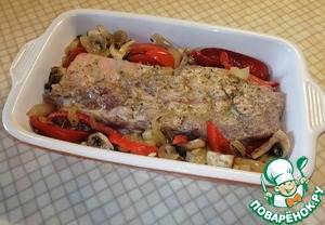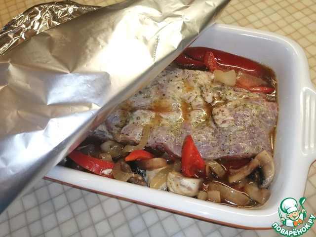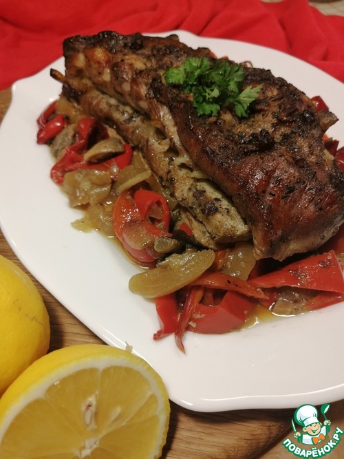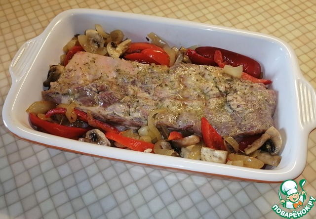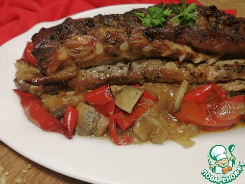Иногда хочется побаловать себя и близких вкусными, нежными, ароматными свиными рёбрышками с луком, грибами и перцем, запечёнными в духовке.