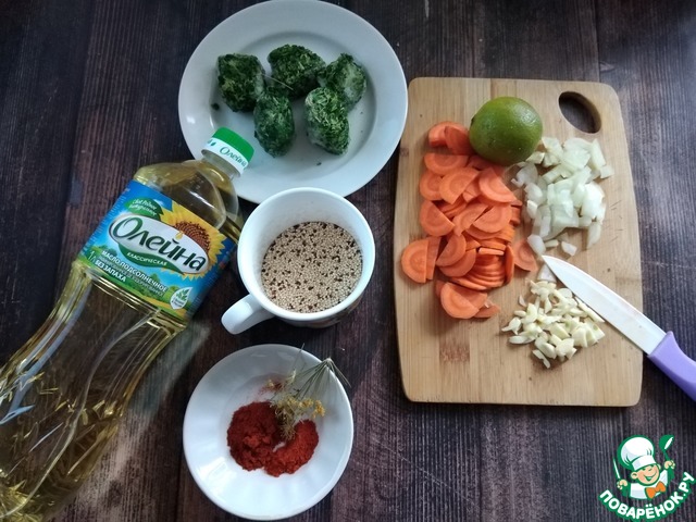 Готовим продукты для супа. Киноа нужно промыть. Шпинат у меня замороженный покупной в шайбочках. Вынула его из холодильника перед приготовлением супа. Чеснок и лук мелко режем, морковь - полу-дольками (если не любите так, то натрите на тёрке). -