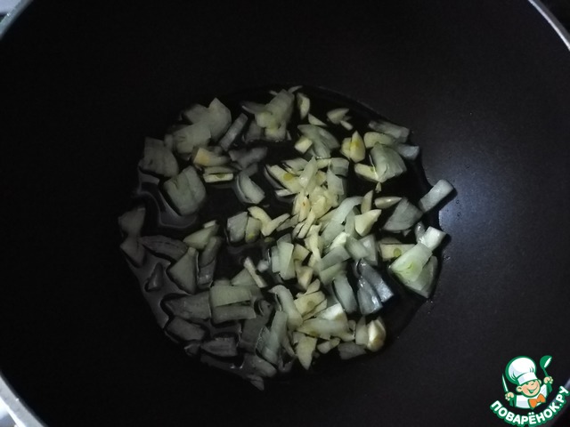 Берём кастрюлю с толстым дном, где в начале будет томить овощи, а затем варить суп. Наливаем масло подсолнечное. Я использую ТМ Олейна подсолнечное. Греем его и выкладываем чеснок и лук.