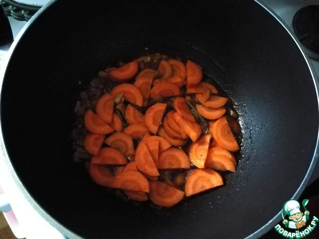 Выкладываем морковь. Убавляем огонь на минимум и томим минут 5.