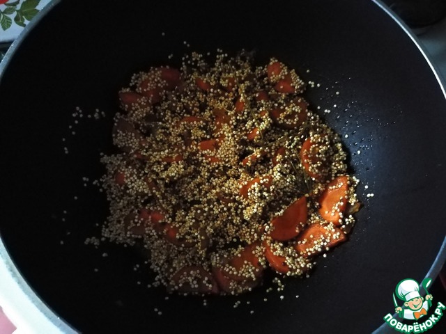 Выкладываем киноа. Перемешиваем, даём киноа пропитаться всеми ароматами.