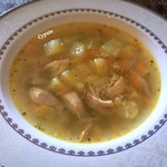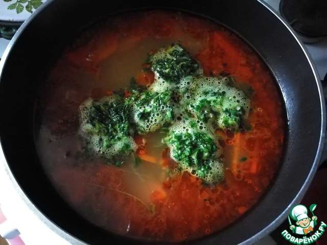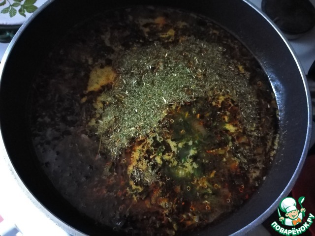 Добавляем сухой укроп, держим на плите ещё с минуту и снимаем с огня. Даём супу минут 15 постоять.