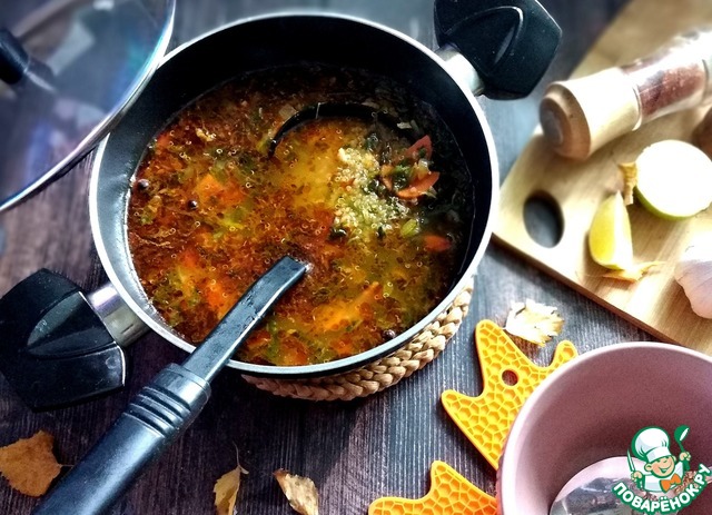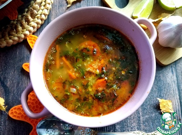 Заливаем горячим бульоном, доводим до кипения, варим на минимальном огне под крышкой до готовности киноа и моркови, солим по вкусу. Выкладываем шпинат, варим пару минут и отжимаем в суп сок лайма. Я отжала сок из четверти лайма. Ещё раз пробуем на соль и если что, то досолите по вкусу.