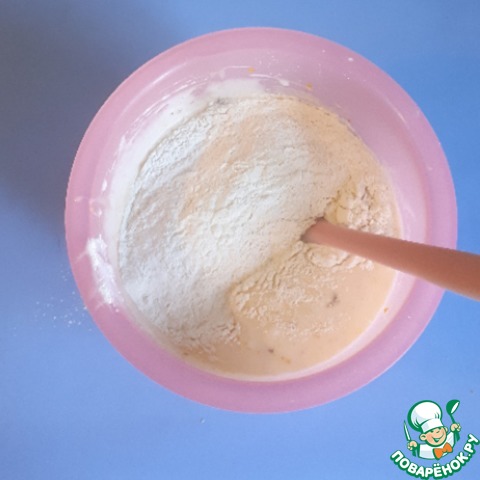 Муку просеять с разрыхлителем теста и добавить к массе, все хорошо перемешать лопаткой снизу вверх.
