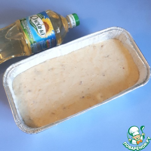 Вылить тесто в форму. Форму предварительно смазать сливочным маслом или маргарином и присыпать мукой, лишнюю муку струсить. Размер моей формы 25 х 12 х 8 см.