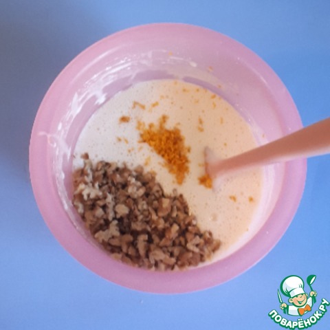 Добавить к массе цедру одного апельсина и измельченные грецкие орехи, перемешать. Орехи я измельчила не сильно мелко ножом.