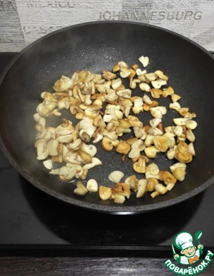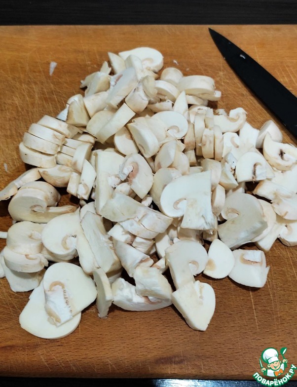 Готовую поленту снимаем с огня и даем немного настояться. Теперь займемся грибами. Шампиньоны необходимо помыть и тонко нарезать слайсами.