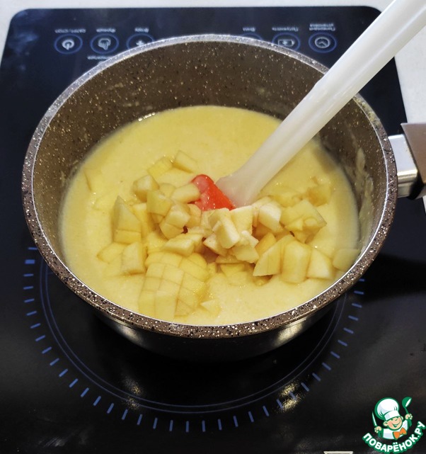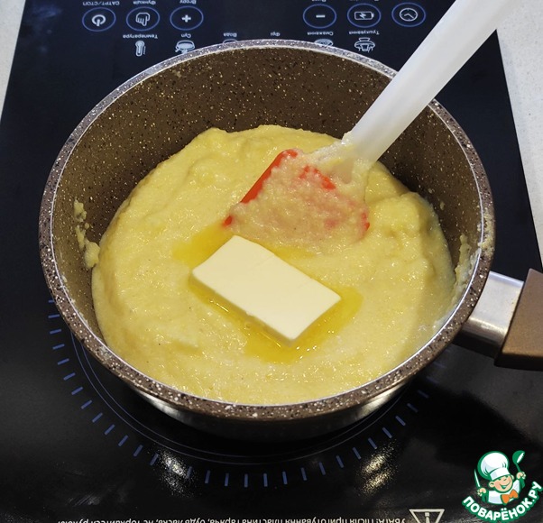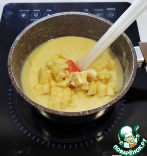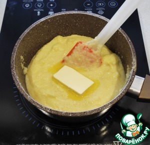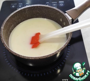 Вливаем воду с молоком и ставим на медленный огонь постоянно помешивая, чтобы не было комочков.