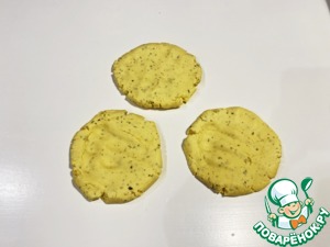Замешиваем тесто. Оно получается слегка рассыпчатым из-за того, что в кукурузной поленте не содержится клейковина. Делим его на три равные части, каждую разминаем руками, формируя лепешку.