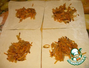 На каждый квадратик теста выкладываем по 1 ст. л: обжаренной смеси. -