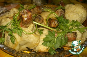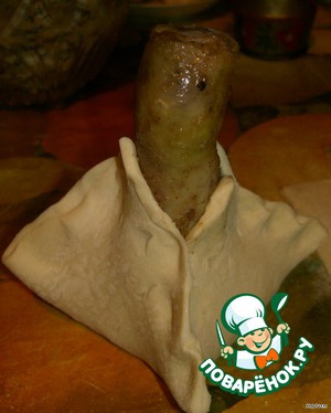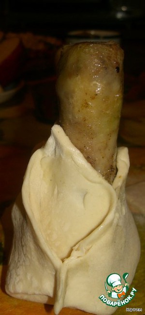 В середину каждого квадрата из теста ставим голень косточкой вверх и слепляем края теста. Мой супруг, когда рассматривал фотки, долго прикалывался. Простите, ничего плохого я не имела ввиду...