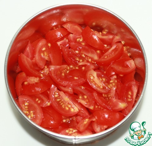 Первый слой - выложить нарезанные помидоры в салатник и полить сверху сметаной.