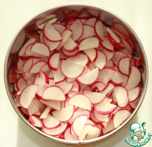 Второй слой - редис, нарезанный на произвольные кусочки.