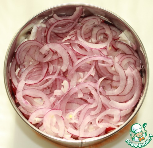 Третий слой - лук, нарезанный полукольцами + соль по вкусу.