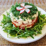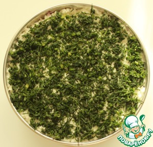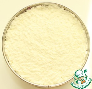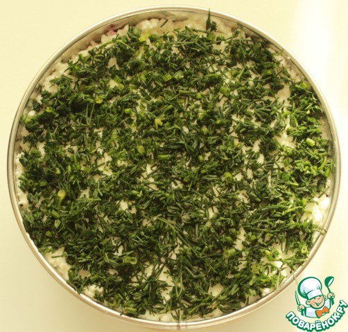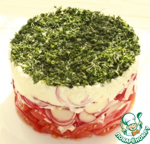 P.S. Каждый стой салата плотно утрамбовывать ложкой и слегка смазывать сметаной. -