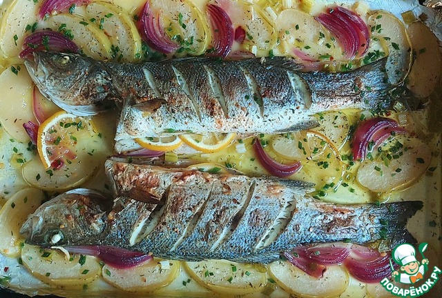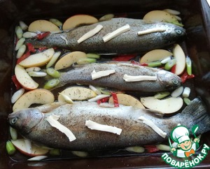 Противень смазать растительным маслом и уложить рыбу. Присыпать рыбу тимьяном, так же внутри и снаружи. В брюшко вложить дольки лимона. Перец чили можно взять свежий, а можно и сухой, молотый. Посыпать вокруг луком и уложить яблочные дольки. Аккуратно налить сидр.