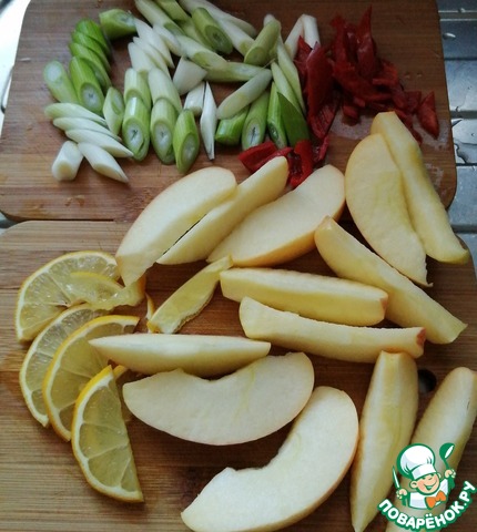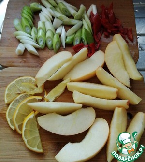 Нарезать лук крупными кусочками наискосок. Лимон и яблоки на дольки.