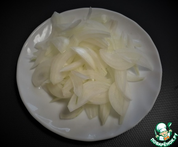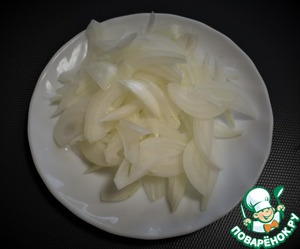 Лук почистить, разрезать пополам вдоль. Каждую половинку перевернуть срезом вниз и нарезать слайсами.