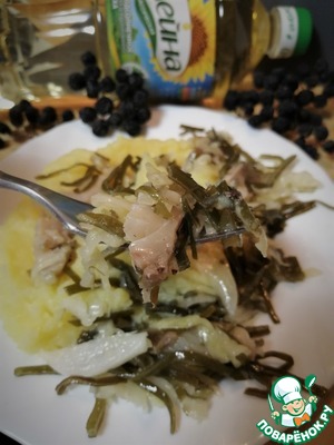 Затем добавить морскую капусту, лук, кусочки рыбы.