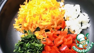 Приготовить начинку : морковь натереть на крупной тёрке, лук, перец болгарский порезать, шпинат, добавить соль и перец (по вкусу, будет ещё сыр)