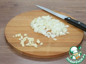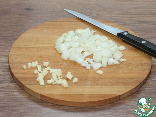 5. Очищенные: репчатый лук и чеснок нарезаем и обжариваем на растительном масле до "прозрачности".