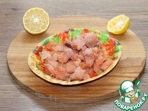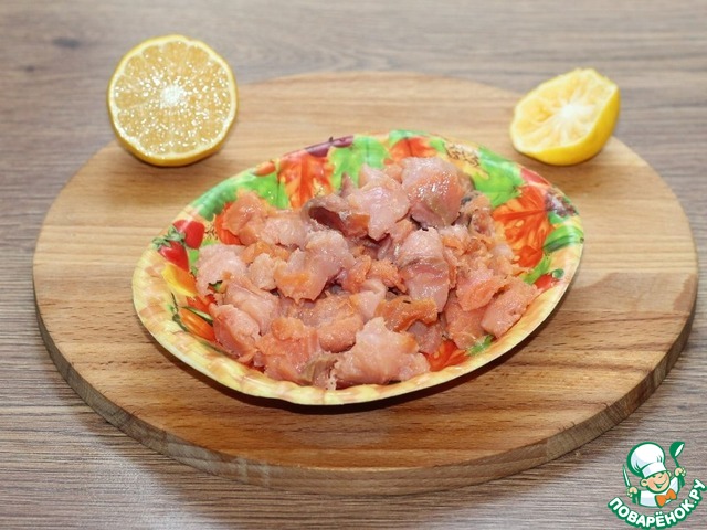 6. Горбушу х/к очищаем от косточек и шкурки. Сбрызгиваем кусочки рыбы лимонным соком и перемешиваем.