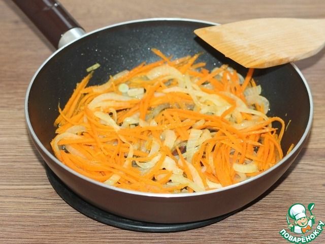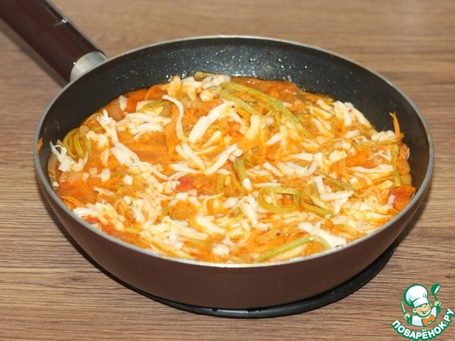10. К готовым овощам добавляем тертый плавленный сыр и аккуратно перемешиваем овощи до расплавления сыра.