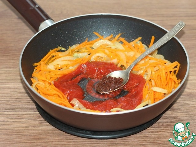 6. К пассеровке добавляем томатную пасту и аджику, перемешиваем.