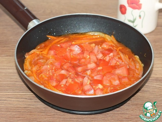 • 7. Нарезаем помидор мелкими кубиками и выкладываем в сковороду.