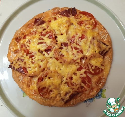 Смазываю томатным соусом, выкладываю начинку (любую на ваш вкус) и посыпаю бортики кунжутом. Пиццу выпекаю при температуре 250°С - 10 минут, на самом нижнем уровне в духовке. Время выпечки и температура зависят от особенностей духовки.