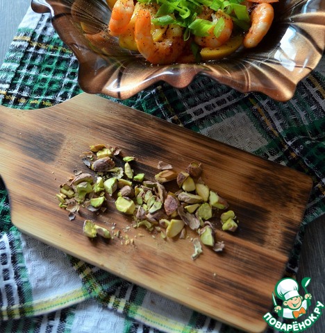 Лук нарезать, добавить в салатник, фисташки порубить.
